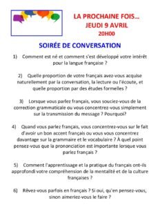 L’événement principal de chaque soir commence à 20h, précédé par l’annonce des informations concernant les semaines à venir, et nous vous invitons à venir dès 19h30 pour bavarder avant le commencement des activités. Normalement, Charlotte fait un ‘petit cours’ avant chaque conférence, et celui-ci commence à 19h. Pendant ce cours nous nous penchons, de façon pas trop sérieuse, sur des questions de vocabulaire et de grammaire.